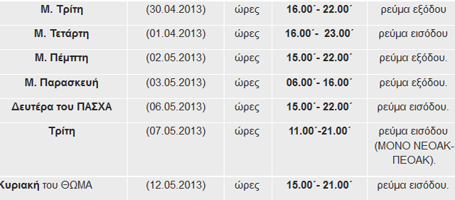 Η Τροχαία έχει λάβει έκτακτα μέτρα για την αποφυγή ατυχημάτων. Αυξημένη κατά 25% είναι η κίνηση στο λιμάνι του Πειραιά σε σχέση με την περυσινή έξοδο του Πάσχα και τα πλοία έχουν πληρότητα 100% για Κυκλάδες, Σάμο και Ικαρία και 90% για άλλους προορισμούς.