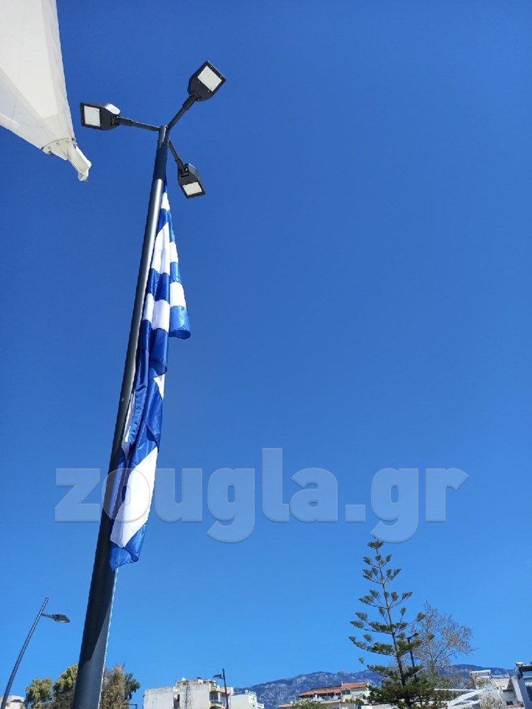 Ένας στολισμός ωστόσο προκάλεσε εντύπωση. Ο λόγος για την κεντρική πλατεία της Κορίνθου, όπου, όπως θα δείτε στο βίντεο και τις φωτογραφίες του zougla.gr, ο δήμαρχος αντί να κρεμάσει την ελληνική σημαία σε ιστό, την κρέμασε σε… κολόνα.