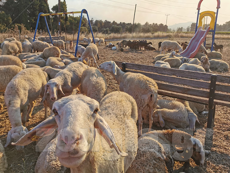 Σε μία παιδική χαρά αναγκάστηκε να κλείσει τα πρόβατά του ένας βοσκός στο Αλαμάνο Κορινθίας προκειμένου να τα προστατεύσει από τη φωτιά που ξέσπασε χθες στην περιοχή και εξακολουθεί να είναι σε εξέλιξη.