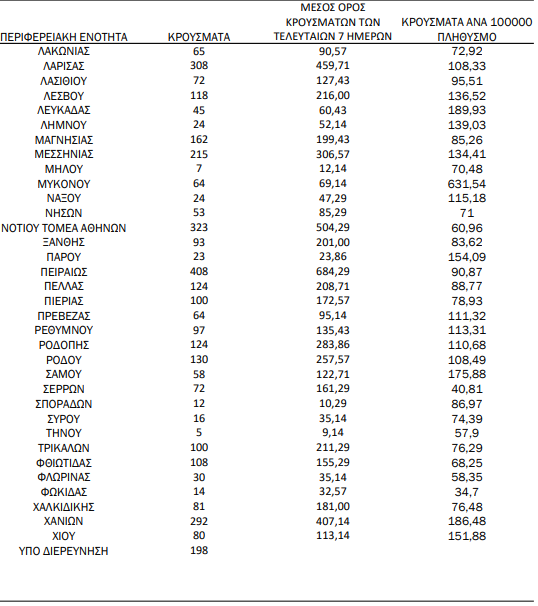 Τα νέα εργαστηριακά επιβεβαιωμένα κρούσματα της νόσου που καταγράφηκαν τις τελευταίες 24 ώρες είναι 10.853, εκ των οποίων 66 εντοπίστηκαν κατόπιν ελέγχων στις πύλες εισόδου της χώρας. Ο συνολικός αριθμός των κρουσμάτων ανέρχεται σε 2.174.093 (ημερήσια μεταβολή +0.5%), εκ των οποίων 49.7% άνδρες. Με βάση τα επιβεβαιωμένα κρούσματα των τελευταίων 7 ημερών, 409 θεωρούνται σχετιζόμενα με ταξίδι από το εξωτερικό και 2.509 είναι σχετιζόμενα με ήδη γνωστό κρούσμα.