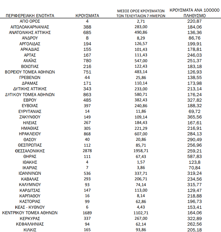 Τα νέα εργαστηριακά επιβεβαιωμένα κρούσματα της νόσου που καταγράφηκαν τις τελευταίες 24 ώρες είναι 22.889, εκ των οποίων 64 εντοπίστηκαν κατόπιν ελέγχων στις πύλες εισόδου της χώρας. Ο συνολικός αριθμός των κρουσμάτων ανέρχεται σε 2.090.383 (ημερήσια μεταβολή +1.1%), εκ των οποίων 49.8% άνδρες. 1 2 Με βάση τα επιβεβαιωμένα κρούσματα των τελευταίων 7 ημερών, 399 θεωρούνται σχετιζόμενα με ταξίδι από το εξωτερικό και 2.392 είναι σχετιζόμενα με ήδη γνωστό κρούσμα.