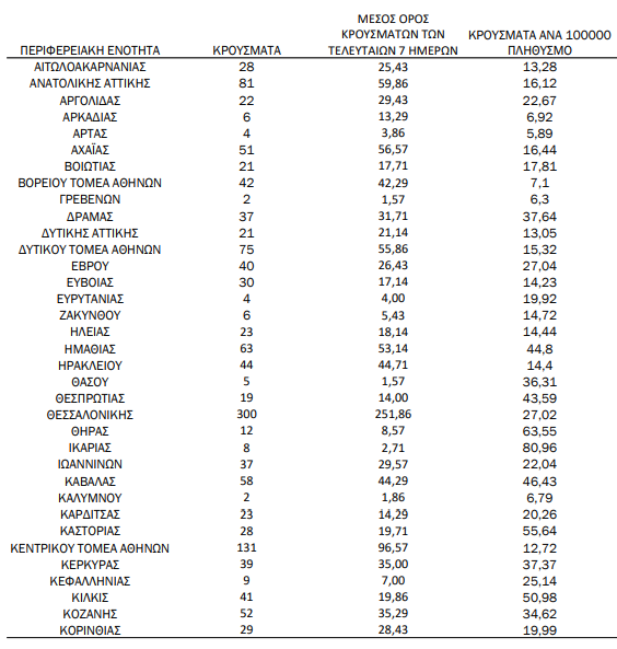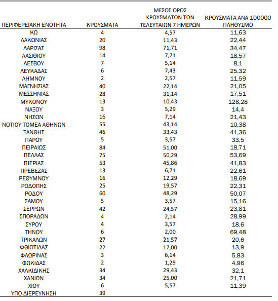 Τα νέα εργαστηριακά επιβεβαιωμένα κρούσματα της νόσου που καταγράφηκαν τις τελευταίες 24 ώρες είναι 2.322, εκ των οποίων 11 εντοπίστηκαν κατόπιν ελέγχων στις πύλες εισόδου της χώρας. Ο συνολικός αριθμός των κρουσμάτων ανέρχεται σε 625.083 (ημερήσια μεταβολή +0.4%), εκ των οποίων 51.0% άνδρες. Με βάση τα επιβεβαιωμένα κρούσματα των τελευταίων 7 ημερών, 139 θεωρούνται σχετιζόμενα με ταξίδι από το εξωτερικό και 2.775 είναι σχετιζόμενα με ήδη γνωστό κρούσμα.