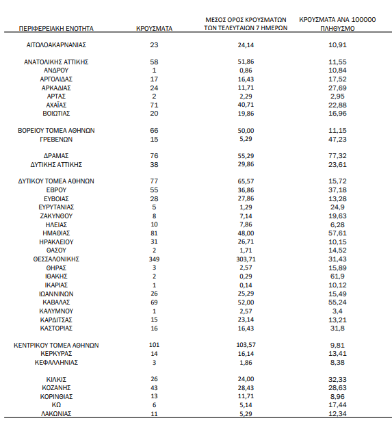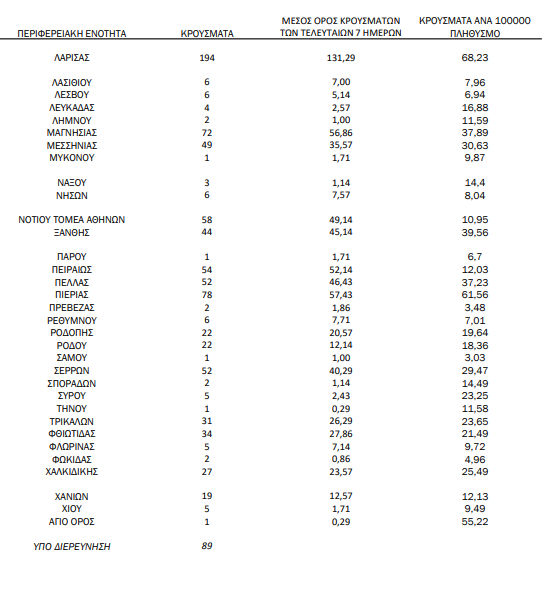 Υπενθυμίζεται πως τα περισσότερα σε αριθμό περιστατικά που έχει καταγράψει ο ΕΟΔΥ σε μία ημέρα ανακοινώθηκαν στις 24 Αυγούστου 2021, όταν εντοπίστηκαν 4.608 περιπτώσεις σε ένα 24ωρο. Επίσης, ο μεγαλύτερος αριθμός θανάτων εξαιτίας του ιού σε ένα 24ωρο καταγράφηκε το Σάββατο 28 Νοεμβρίου, όταν έχασαν τη ζωή τους 121 ασθενείς.