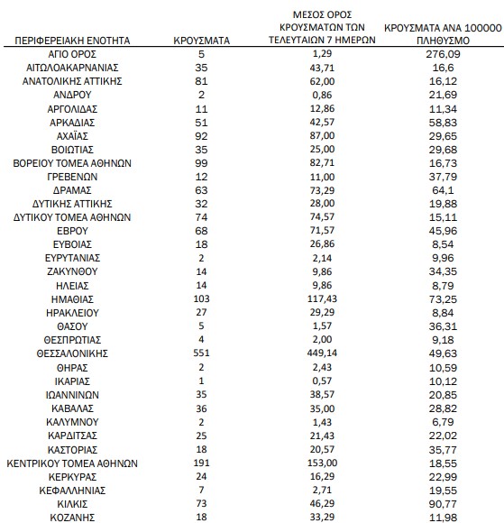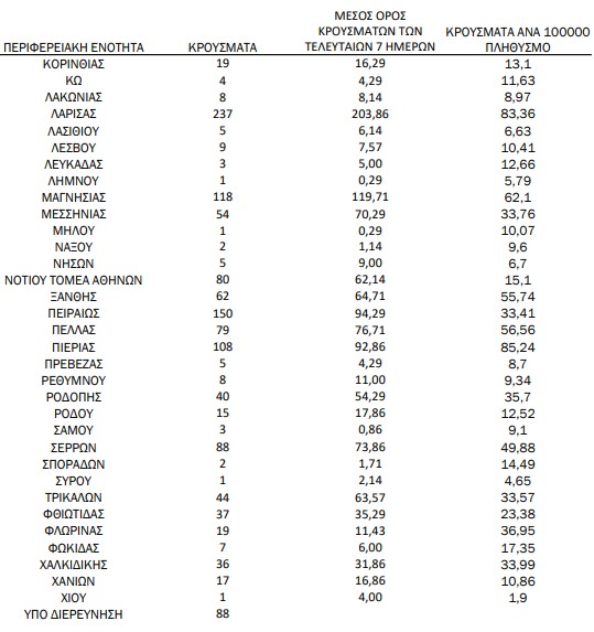 Υπενθυμίζεται πως τα περισσότερα σε αριθμό περιστατικά που έχει καταγράψει ο ΕΟΔΥ σε μία ημέρα ανακοινώθηκαν στις 24 Αυγούστου 2021, όταν εντοπίστηκαν 4.608 περιπτώσεις σε ένα 24ωρο. Επίσης, ο μεγαλύτερος αριθμός θανάτων εξαιτίας του ιού σε ένα 24ωρο καταγράφηκε το Σάββατο 28 Νοεμβρίου, όταν έχασαν τη ζωή τους 121 ασθενείς.