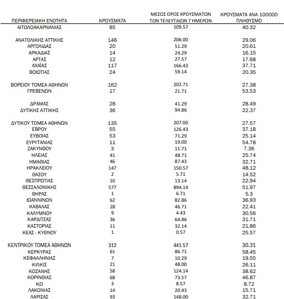 Υπενθυμίζεται πως τα περισσότερα σε αριθμό περιστατικά που είχε καταγράψει ο ΕΟΔΥ μέχρι σήμερα σε μία ημέρα ανακοινώθηκαν την Τρίτη 9 Νοεμβρίου 2021, όταν εντοπίστηκαν 8.613 περιπτώσεις σε ένα 24ωρο. Επίσης, ο μεγαλύτερος αριθμός θανάτων εξαιτίας του ιού σε ένα 24ωρο καταγράφηκε το Σάββατο 28 Νοεμβρίου 2020, όταν έχασαν τη ζωή τους 121 ασθενείς.