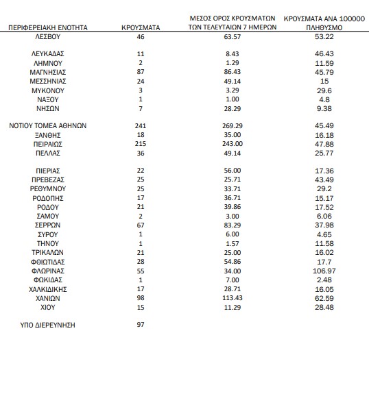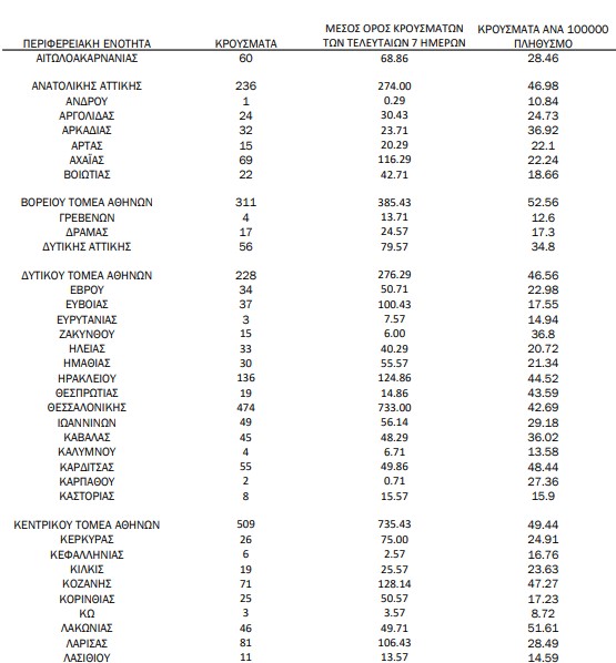 Τα νέα εργαστηριακά επιβεβαιωμένα κρούσματα της νόσου που καταγράφηκαν τις τελευταίες 24 ώρες είναι 4.036, εκ των οποίων 8 εντοπίστηκαν κατόπιν ελέγχων στις πύλες εισόδου της χώρας. Ο συνολικός αριθμός των κρουσμάτων ανέρχεται σε 1.074.869 (ημερήσια μεταβολή +0.4%), εκ των οποίων 50.4% άνδρες. Με βάση τα επιβεβαιωμένα κρούσματα των τελευταίων 7 ημερών, 206 θεωρούνται σχετιζόμενα με ταξίδι από το εξωτερικό και 2.409 είναι σχετιζόμενα με ήδη γνωστό κρούσμα.