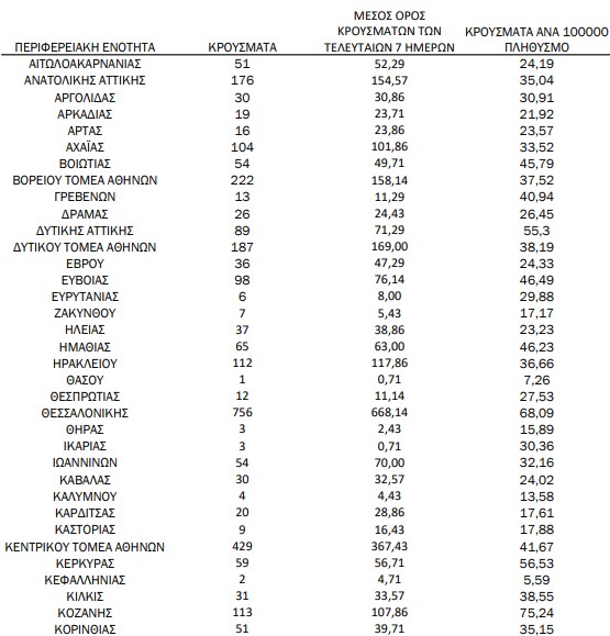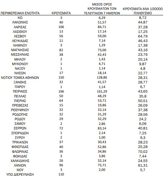 Τα νέα εργαστηριακά επιβεβαιωμένα κρούσματα της νόσου που καταγράφηκαν τις τελευταίες 24 ώρες είναι 4.345, εκ των οποίων 11 εντοπίστηκαν κατόπιν ελέγχων στις πύλες εισόδου της χώρας. Ο συνολικός αριθμός των κρουσμάτων ανέρχεται σε 1.031.239 (ημερήσια μεταβολή +0.4%), εκ των οποίων 50.5% άνδρες. Με βάση τα επιβεβαιωμένα κρούσματα των τελευταίων 7 ημερών, 207 θεωρούνται σχετιζόμενα με ταξίδι από το εξωτερικό και 3.409 είναι σχετιζόμενα με ήδη γνωστό κρούσμα.