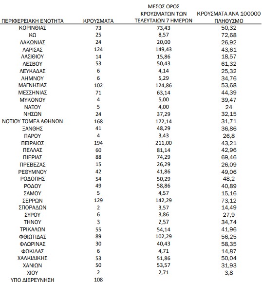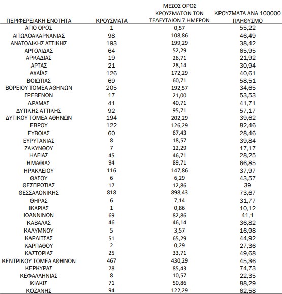 Υπενθυμίζεται πως τα περισσότερα σε αριθμό περιστατικά που είχε καταγράψει ο ΕΟΔΥ μέχρι σήμερα σε μία ημέρα ανακοινώθηκαν την Τρίτη 9 Νοεμβρίου 2021, όταν εντοπίστηκαν 8.613 περιπτώσεις σε ένα 24ωρο. Επίσης, ο μεγαλύτερος αριθμός θανάτων εξαιτίας του ιού σε ένα 24ωρο καταγράφηκε το Σάββατο 28 Νοεμβρίου 2020, όταν έχασαν τη ζωή τους 121 ασθενείς.