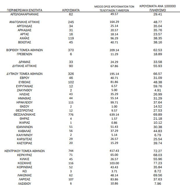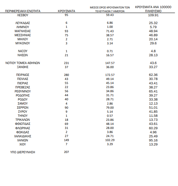 Με βάση τα επιβεβαιωμένα κρούσματα των τελευταίων 7 ημερών, 214 θεωρούνται σχετιζόμενα με ταξίδι από το εξωτερικό και 2.964 είναι σχετιζόμενα με ήδη γνωστό κρούσμα. To RT για την επικράτεια βάσει των κρουσμάτων εκτιμάται σε 0.96 (95% ΔΕ: 0.87 – 1.05)