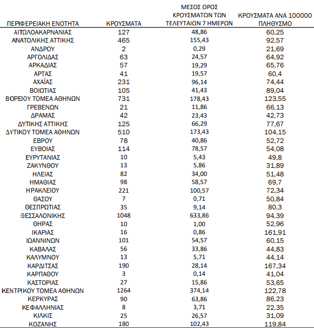 Τα νέα εργαστηριακά επιβεβαιωμένα κρούσματα της νόσου που καταγράφηκαν τις τελευταίες 24 ώρες είναι 9.284, εκ των οποίων 11 εντοπίστηκαν κατόπιν ελέγχων στις πύλες εισόδου της χώρας. Ο συνολικός αριθμός των κρουσμάτων ανέρχεται σε 1.084.153 (ημερήσια μεταβολή +0,9%), εκ των οποίων 50,4% άνδρες. Με βάση τα επιβεβαιωμένα κρούσματα των τελευταίων 7 ημερών, 192 θεωρούνται σχετιζόμενα με ταξίδι από το εξωτερικό και 1.838 είναι σχετιζόμενα με ήδη γνωστό κρούσμα.