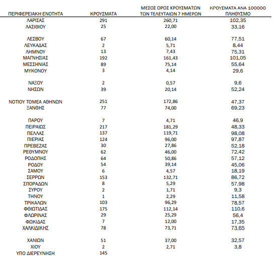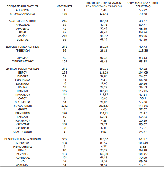 Υπενθυμίζεται πως τα περισσότερα σε αριθμό περιστατικά που είχε καταγράψει ο ΕΟΔΥ μέχρι σήμερα σε μία ημέρα ανακοινώθηκαν την Τρίτη 9 Νοεμβρίου 2021, όταν εντοπίστηκαν 8.613  περιπτώσεις σε ένα 24ωρο. Επίσης, ο μεγαλύτερος αριθμός θανάτων εξαιτίας του ιού σε ένα 24ωρο καταγράφηκε το Σάββατο 28 Νοεμβρίου 2020, όταν έχασαν τη ζωή τους 121 ασθενείς.