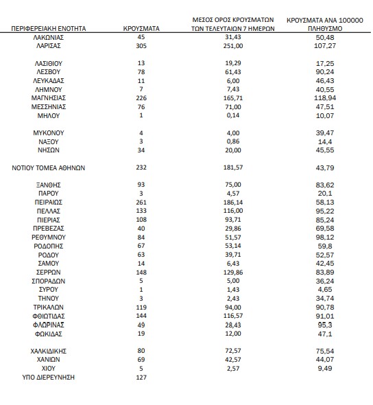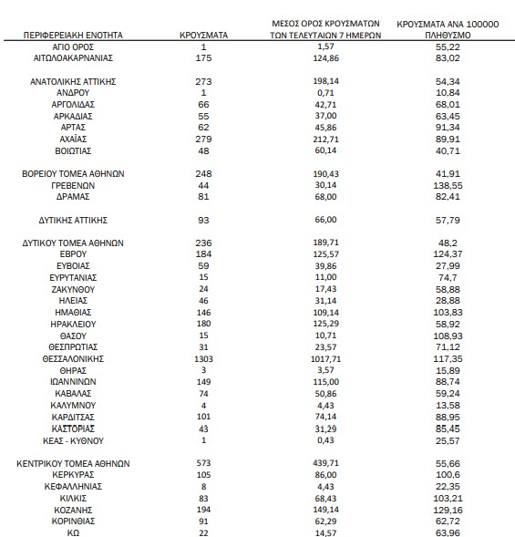 Υπενθυμίζεται πως τα περισσότερα σε αριθμό περιστατικά που είχε καταγράψει ο ΕΟΔΥ μέχρι σήμερα σε μία ημέρα ανακοινώθηκαν την Τρίτη 9 Νοεμβρίου 2021, όταν εντοπίστηκαν 8.613 περιπτώσεις σε ένα 24ωρο. Επίσης, ο μεγαλύτερος αριθμός θανάτων εξαιτίας του ιού σε ένα 24ωρο καταγράφηκε το Σάββατο 28 Νοεμβρίου 2020, όταν έχασαν τη ζωή τους 121 ασθενείς.