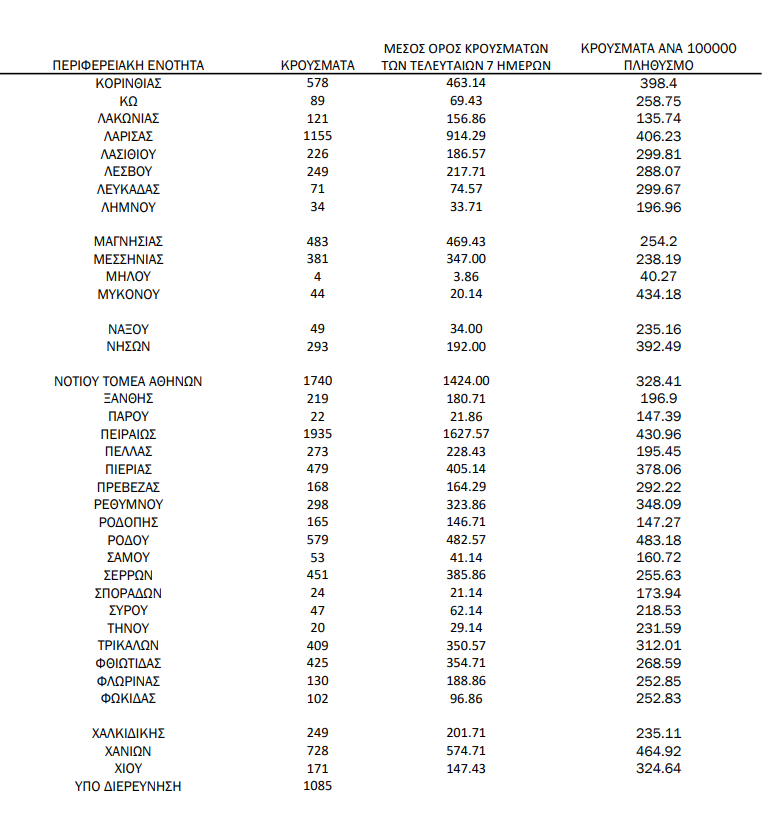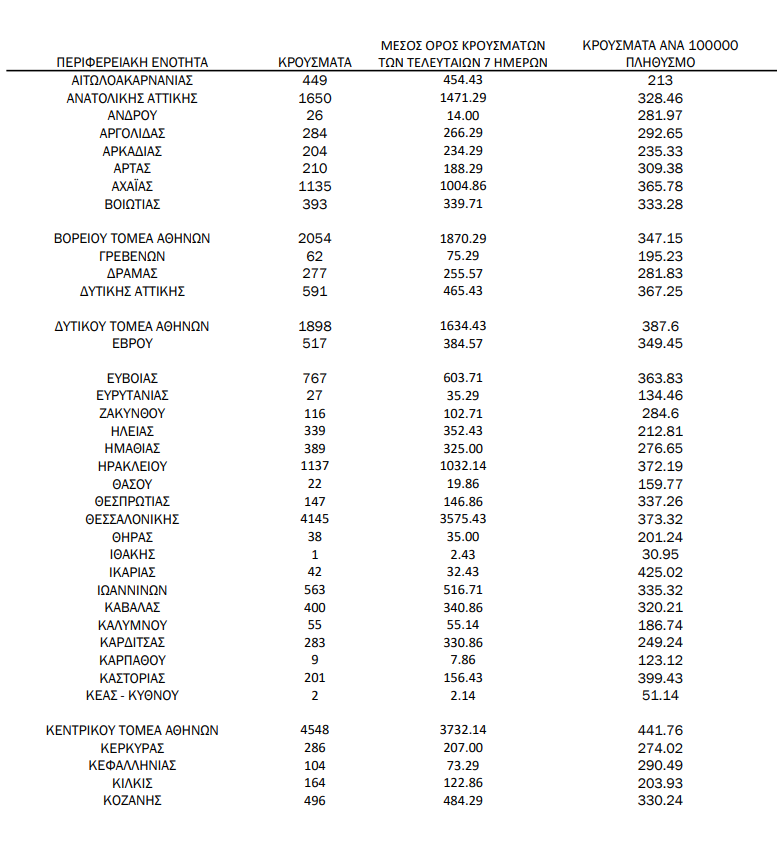 Τα νέα εργαστηριακά επιβεβαιωμένα κρούσματα της νόσου που καταγράφηκαν τις τελευταίες 24 ώρες είναι 37.676 , εκ των οποίων 93 εντοπίστηκαν κατόπιν ελέγχων στις πύλες εισόδου της χώρας. Ο συνολικός αριθμός των κρουσμάτων ανέρχεται σε 1.489.024 (ημερήσια μεταβολή +2.6%), εκ των οποίων 50.0% άνδρες. 1 Με βάση τα επιβεβαιωμένα κρούσματα των τελευταίων 7 ημερών, 524 θεωρούνται σχετιζόμενα με ταξίδι από το εξωτερικό και 1.814 είναι σχετιζόμενα με ήδη γνωστό κρούσμα.