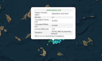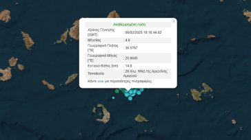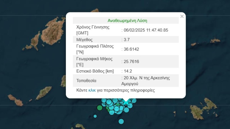 Στις 14.18 της Πέμπτης έγινε σεισμός 3,7 Ρίχτερ, με επίκεντρο 23 Χλμ. ΝΝΔ της Αρκεσίνης Αμοργού και εστιακό βάθος 12,8 χιλιόμετρα.