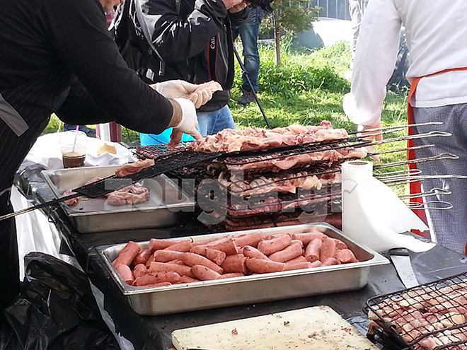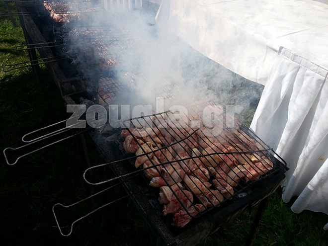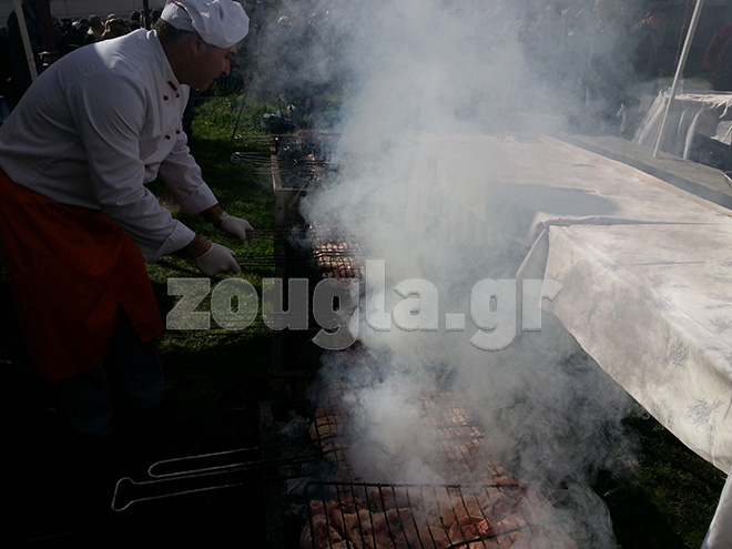 Άναψαν οι φωτιές στις 11 το πρωί στις ψησταριές στη Βαρβάκειο προκειμένου να διανεμηθεί σε δημότες και επισκέπτες 1,5 τόνος κρέατος και κρασί.