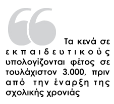 Τουλάχιστον 3.000 θέσεις εκπαιδευτικών θα παραμείνουν κενές στην αρχή της σχολικής χρονιάς, καθώς οι συνταξιοδοτήσεις των δύο τελευταίων ετών σε συνδυασμό με το «πάγωμα» των προσλήψεων έχουν μειώσει τον αριθμό των εργαζομένων στην πρωτοβάθμια και δευτεροβάθμια εκπαίδευση. Ο προβληματισμός της εκπαιδευτικής κοινότητας είναι έντονος, αφού τα προβλήματα είναι αρκετά και ο χρόνος λίγος.