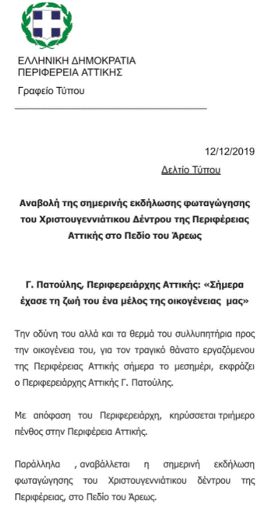 Ο Περιφερειάρχης Αττικής, Γιώργος Πατούλης μετά το τραγικό περιστατικό ανέβαλε τη φωταγώγηση του χριστουγεννιάτικου δέντρου.