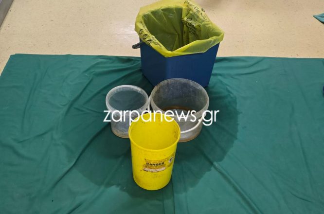 Κουβάδες σφουγγαρίσματος, λεκάνες σε διάφορα μεγέθη αλλά και διαφόρων ειδών συσκευασίες τύπου τάπερ απαθανάτισε επισκέπτρια στον όροφο των χειρουργείων στο Γενικό Νοσοκομείο Χανίων!