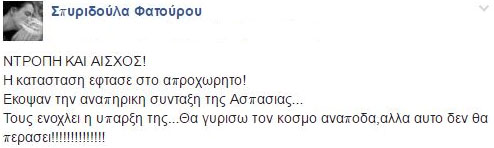 Απέναντι σε αυτή την τραγική απόφαση που σοκάρει οποιονδήποτε λογικό άνθρωπο η Σπυριδούλα Φατούρου έγραψε στο facebook: Η κατάσταση έφτασε στο απροχώρητο! Έκοψαν την αναπηρική σύνταξη της Ασπασίας… Τους ενοχλεί η ύπαρξη της…Θα γυρίσω τον κόσμο ανάποδα αλλά αυτό δεν θα περάσει!!!!!!!!!!!!!!