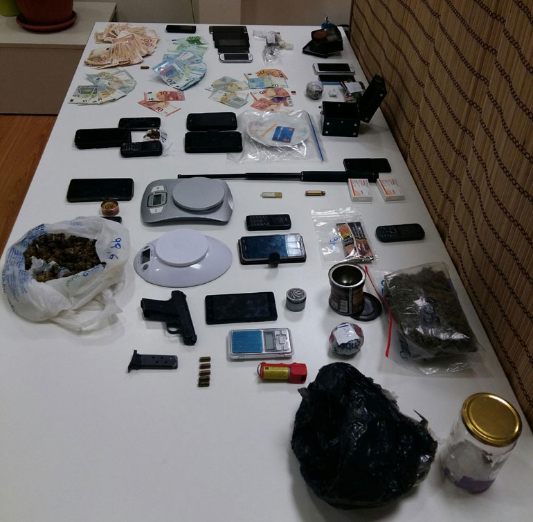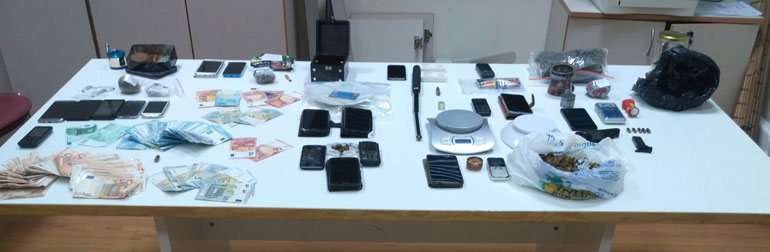 Στο πλαίσια αστυνομικής επιχείρησης πραγματοποιήθηκαν δεκαέξι έρευνες σε σπίτια των συλληφθέντων, όπου κατασχέθηκαν 9,7 κιλά κάνναβης, 506,5 γραμμάρια κοκαΐνης, 3 ζυγαριές ακριβείας, χρηματικό ποσό 8.995 ευρώ, 20 κινητά τηλέφωνα, 3 τσιγάρα κάνναβης, 1 σπρέι πιπεριού, 1 πιστόλι κρότου με 5 φυσίγγια.