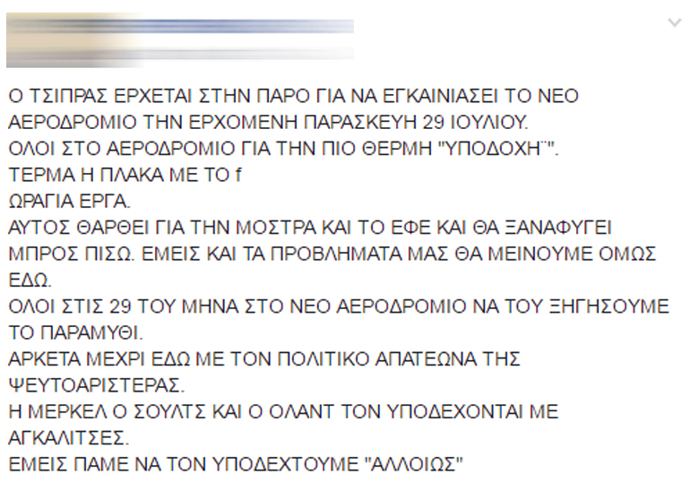 Τον… μπελά του βρήκε ο υπάλληλος της Δημοτικής Επιχείρησης Πολιτισμού του Δήμου Πάρου, Λευτέρης Καρποδίνης, ο οποίος συνελήφθη και κρατούνταν επί 3,5 ώρες στο τοπικό Αστυνομικό Τμήμα, καθώς -στον προσωπικό του λογαριασμό στο Facebook- ανήρτησε σχόλια για την παρουσία του Πρωθυπουργού, Αλέξη Τσίπρα, στο νησί με αφορμή τα εγκαίνια του αεροδρομίου.