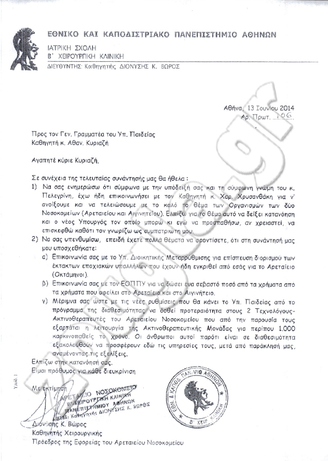 H επιστολή του κ. Βώρου, καθηγητή χειρουργικής προς τον Γενικό Γραμματέα του Υπουργείου Παιδείας καθηγητή κ. Αθάνασιο Κυριαζή: