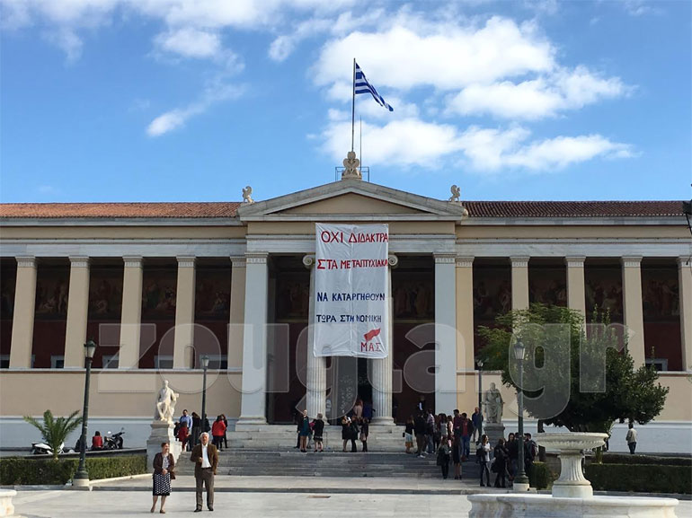 Το Μέτωπο Αγώνα Σπουδαστών ανήρτησε το πρωί της Τετάρτης μεγάλο πανό στα Προπύλαια, στο οποίο αναγραφόταν...