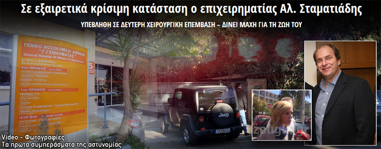 Μάχη για τη ζωή δίνει ο επιχειρηματίας Αλέξανδρος Σταματιάδης, έπειτα από τη χθεσινή επίθεση που δέχθηκε στο σπίτι του στην Κηφισιά από ένοπλους ληστέςΟ κ. Σταματιάδης νοσηλεύεται στη Μονάδα Εντατικής Θεραπείας του νοσοκομείου «Γ. Γεννηματάς», ενώ χθες υποβλήθηκε σε πολύωρα χειρουργεία σε θώρακα και κοιλιακή χώρα. Λόγω αιμορραγίας, του αφαιρέθηκε το δεξί νεφρό. Οι γιατροί αναμένουν πώς θα ανταποκριθεί ο οργανισμός του τα επόμενα εικοσιτετράωρα, τα οποία θα είναι κρίσιμα.