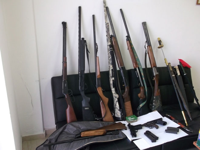 Κατά τον έλεγχο εντοπίστηκαν και κατασχέθηκαν δύο πιστόλια, ένα περίστροφο, τέσσερις γεμιστήρες, 1850 φυσίγγια διαφόρων τύπων και διαμετρημάτων, 8 κυνηγετικές καραμπίνες, δύο ξίφη, μία ξιφολόγχη, δύο μαχαίρια και 8 κροτίδες.
