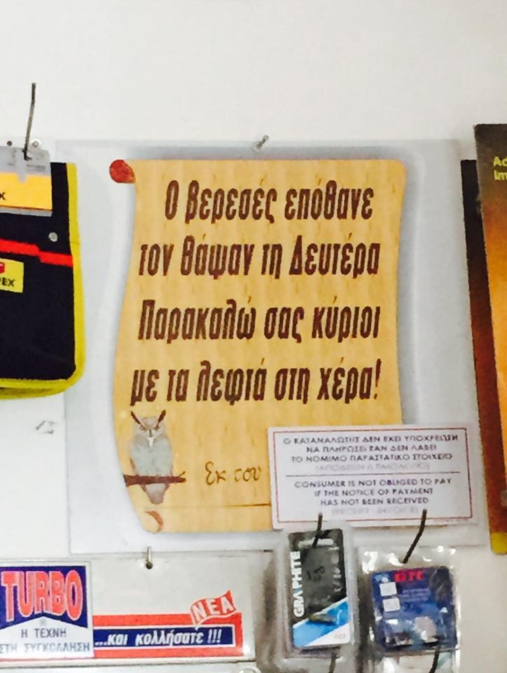 Αυτά αναγράφονται σε μία αφίσα που έχει κολλήσει στον τοίχο ο ιδιοκτήτης μίας επιχείρησης στις Μοίρες του Ηρακλείου Κρήτης, προφανώς για να στείλει το μήνυμα στους πελάτες του ότι δεν πουλάει αν δεν εισπράξει…