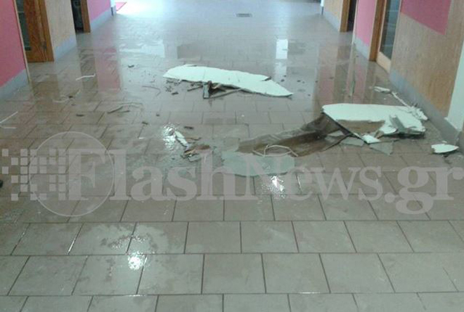 Το πρωί που μπήκαν οι εργαζόμενοι στα γραφεία είδαν έκπληκτοι ένα μεγάλο κομμάτι της ψευδοροφής να έχει πέσει μαζί με κάποια αλουμινένια υποστηρίγματα.