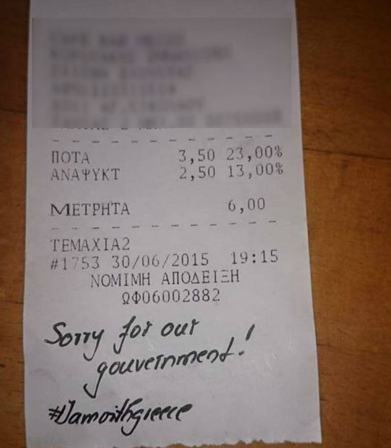 Οι δύο Γερμανοί, κατά την επίσκεψή τους σε καφετέρια της περιοχής, ένιωσαν την ανάγκη να απολογηθούν για την κυβέρνησή τους, γράφοντας ένα μήνυμα στην απόδειξη.