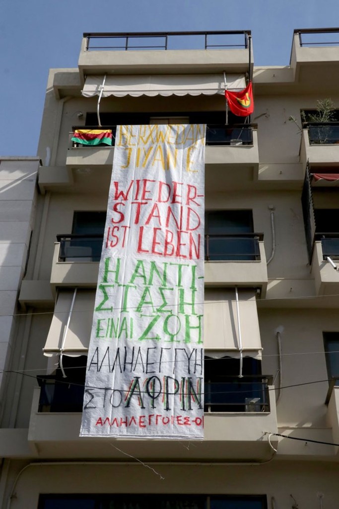 Ομάδα ατόμων που πρόσκεινται στον αντιεξουσιαστικό χώρο εισέβαλε το πρωί της Παρασκευής στο κτήριο όπου στεγάζεται το γερμανικό προξενείο στο Ηράκλειο της Κρήτης. Τα άτομα πήραν τη γερμανική σημαία και κρέμασαν στο μπαλκόνι πανό με συνθήματα αλληλεγγύης για την πόλη Αφρίν στη Συρία.