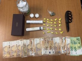 στην οικία του κατά τη διάρκεια της οποίας βρέθηκαν και κατασχέθηκαν μικροποσότητα κάνναβης, σιδηρογροθιά με μαχαίρι και το χρηματικό ποσό των 6.100 ευρώ.