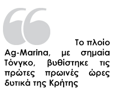 Σύμφωνα με τις πρώτες πληροφορίες, το πλοίο Ag-Marina, με σημαία Τόνγκο, είχε επταμελές πλήρωμα. Όλοι οι ναυτικοί είναι ρωσικής υπηκοότητας. Οι τέσσερις από αυτούς, οι οποίοι είχαν επιβιβαστεί σε σωσίβια λέμβο, περισυνελέγησαν από άλλο φορτηγό πλοίο που έσπευσε προς παροχή βοήθειας.