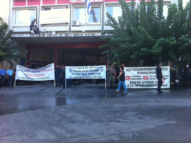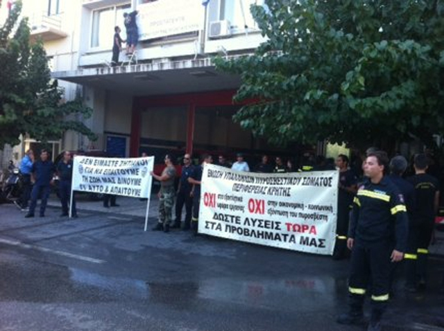 Κινητοποίηση έξω από την Πυροσβεστική Υπηρεσία, επί της οδού Χαριλάου Τρικούπη στο Ηράκλειο Κρήτης, πραγματοποιούν πυροσβέστες, αστυνομικοί και άνδρες του Λιμενικού που διαμαρτύρονται για τις μειώσεις στα ειδικά μισθολόγια.