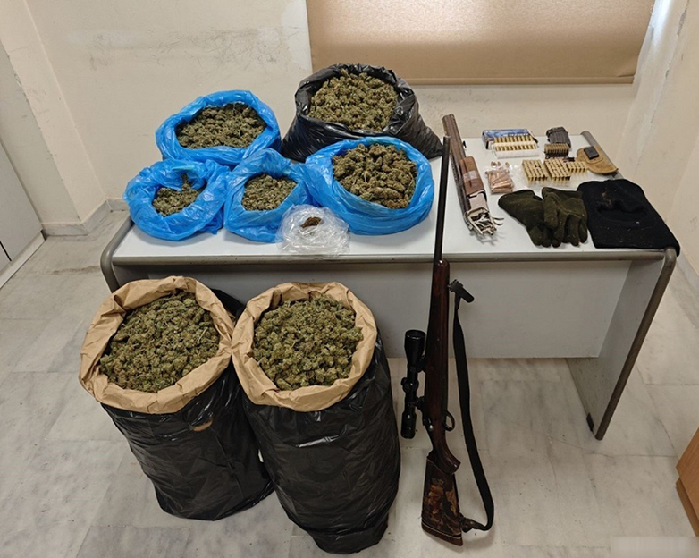 Στο ένα σπίτι βρήκαν 17 κιλά και 328,6 γραμμάρια χασίς, ένα πολεμικό τυφέκιο με διόπτρα, ένα κυνηγετικό όπλο, δύο θήκες όπλου, ένα κυτίο μεταφοράς φυσιγγίων και μία ζυγαριά ακριβείας.