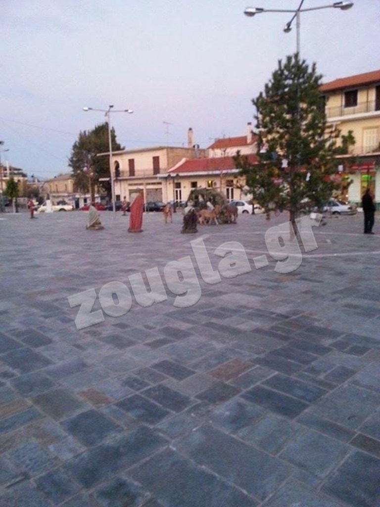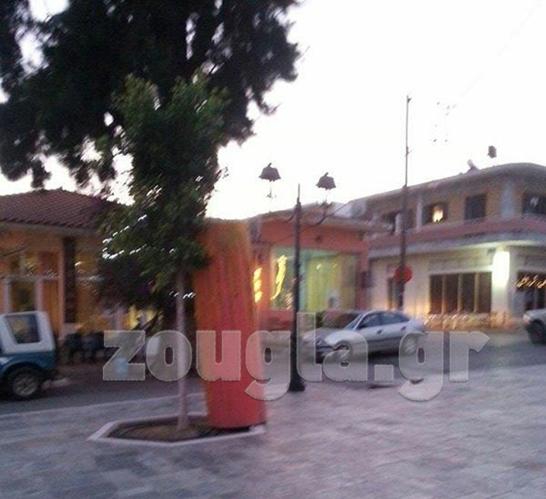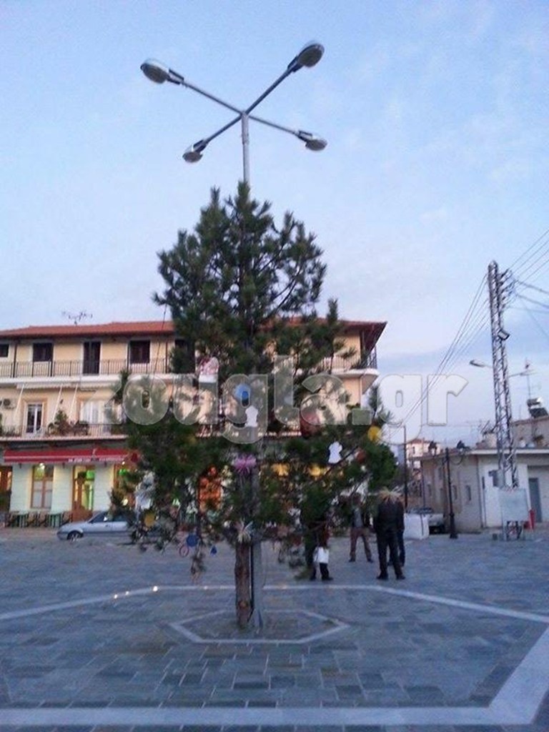 Υπάρχουν όμως κολόνες φωτισμού. Έτσι σκέφτηκαν να αξιοποιήσουν μία από αυτές που βρίσκεται στο κέντρο της πλατείας τοποθετώντας δίπλα της ένα έλατο.