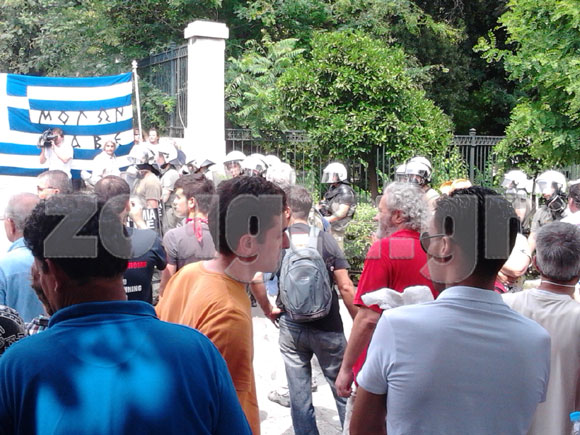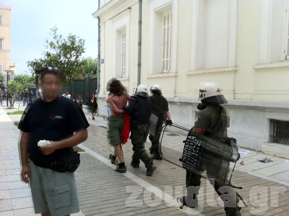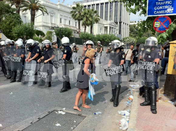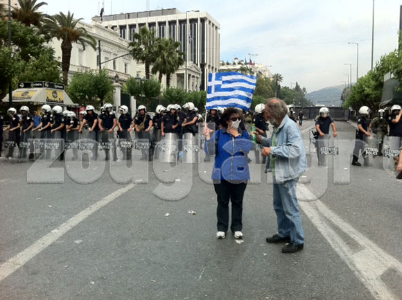 Ομάδα «Αγανακτισμένων» πολιτών, θέλοντας να κατευνάσει τα πνεύματα, προχώρησε σε περιφρούρηση αστυνομικών, προκειμένου να διέλθουν χωρίς πρόβλημα από τη Λ. Αμαλίας.