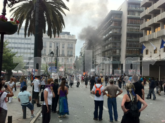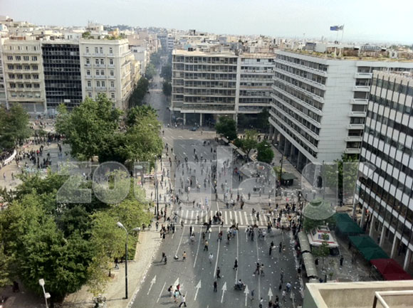 Προηγουμένως, σκηνικό γενικευμένης σύρραξης διαμορφώθηκε στην κάτω πλευρά της πλατείας Συντάγματος, δίπλα στο κτήριο όπου στεγάζεται η Εθνική Τράπεζα, καθώς ομάδες διαδηλωτών συγκρούστηκαν με δυνάμεις των ΜΑΤ, οι οποίες απάντησαν με εκτεταμένη χρήση χημικών αλλά και βομβίδες κρότου-λάμψης.