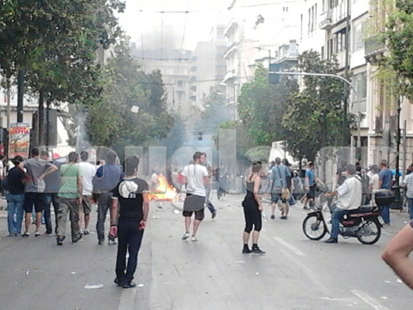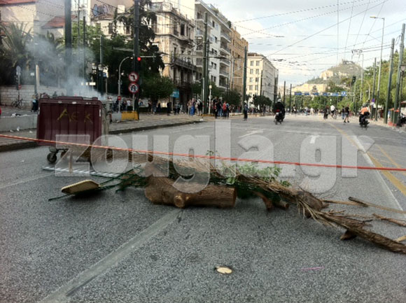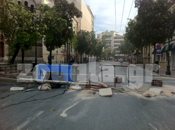 Λίγο μετά τις 15:50 πυρκαγιά εκδηλώθηκε μπροστά στην είσοδο του Μετρό στο Σύνταγμα, ενώ οδοφράγματα με καρέκλες και κάδους απορριμμάτων στήνονται στην οδό Βασ. Γεωργίου.