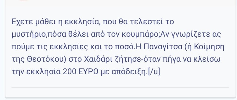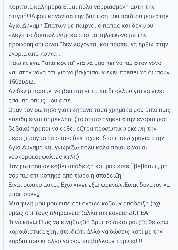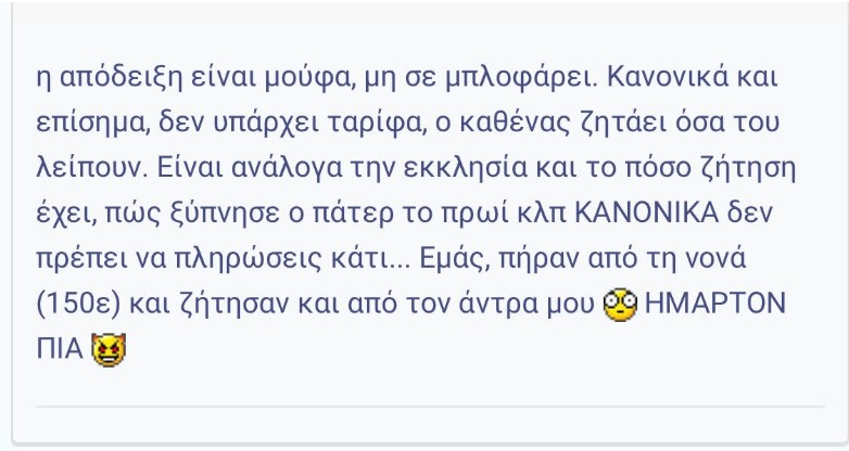 Ωστόσο, οι πιστοί έχουν την εναλλακτική επιλογή να τελέσουν ένα Μυστήριο μια καθημερινή, το οποίο σημαίνει μικρότερο κόστος. Παρ’ όλα αυτά, όσο κι αν ψάξει κάποιος, δεν υπάρχει κάποιος όρος ή κάποια νομοθεσία που να υποχρεώνει τους πιστούς να πληρώνουν μετά την τέλεση ενός Μυστηρίου, παρότι οι παπάδες το θεωρούν δεδομένο. Είναι λογικό αν κάποιος πιστός θέλει να αφήσει από μόνος του ένα ποσό για την εκκλησία. Αυτό που δεν είναι καθόλου λογικό είναι οι ιερείς να απαιτούν να καταβάλλουν οι πιστοί συγκεκριμένα ποσά που δεν είναι καθόλου ευκαταφρόνητα, ειδικά τη σημερινή εποχή που τα περισσότερα νοικοκυριά στερούνται ακόμη και τα βασικά αγαθά. Τα Μυστήρια θα έπρεπε να τελούνται δωρεάν και, φυσικά, οι ιερείς να μη φέρνουν σε δύσκολη θέση τους πιστούς.