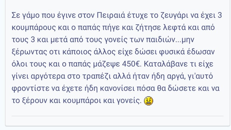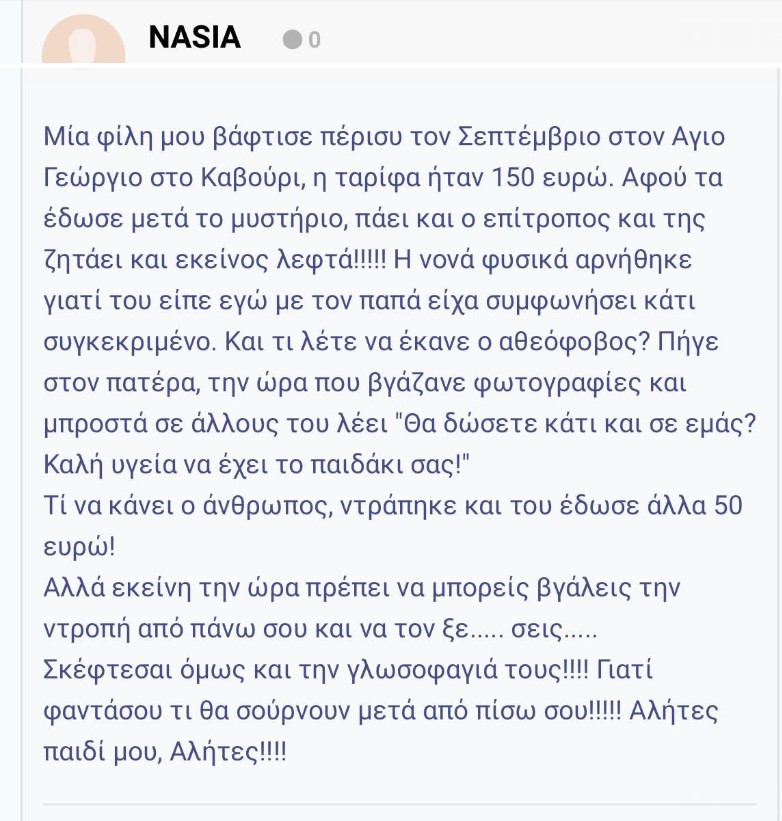 Όταν λοιπόν οι εκπρόσωποι της Εκκλησίας αποζητούν τη νεολαία να βρίσκεται κοντά στην Εκκλησία, όταν στέκονται ενάντια στον πολιτικό γάμο ή στο σύμφωνο συμβίωσης, θα πρέπει να σκεφτούν ότι όλα τα παραπάνω οδηγούν τους νέους στο να μην επιλέξουν να τελέσουν ένα Μυστήριο στην εκκλησία. Και, φυσικά, δεν είναι μόνο το χρηματικό αντίτιμο, αλλά και ο τρόπος με τον οποίο στην ουσία οι ιερείς το «απαιτούν». Να μην ξεχνάμε ότι αλλιώς ακούγεται το «ό,τι έχετε ευχαρίστηση» και αλλιώς «η βάφτιση ή ο γάμος κοστίζει 180 ευρώ». Θα έπρεπε, λοιπόν, οι ιερείς να σκέφτονται λίγο παραπάνω προτού ζητήσουν χρηματική αμοιβή, τη στιγμή που υπάρχουν άνθρωποι που στερούνται βασικά αγαθά και σκέφτονται ακόμα και το πού θα ξοδέψουν έστω 1 ευρώ. Η Εκκλησία δεν κάνει διακρίσεις, οπότε θα πρέπει να μπορούν να τελέσουν κάποιο Μυστήριο και οι πιστοί που δεν διαθέτουν χρήματα χωρίς να το σκεφτούν.