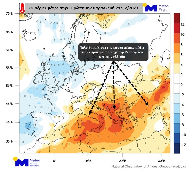 Στο χάρτη που ακολουθεί αποτυπώνεται η απόκλιση της θερμοκρασίας σε σχέση με τις κανονικές για την εποχή τιμές της σε υψόμετρο – οι αέριες μάζες πάνω από τη χώρα μας θα είναι 8-10 βαθμούς θερμότερες από το κανονικά για την εποχή επίπεδα.