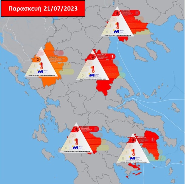 Όπως φαίνεται στο χάρτη που ακολουθεί την Παρασκευή 21/07 επίπεδο επικινδυνότητας 3 αναμένεται σε Αθήνα, Θεσσαλονίκη, Λάρισα και Πάτρα, και επίπεδο επικινδυνότητας 2 (εξαιρετικά υψηλές θερμοκρασίες) στα Ιωάννινα.