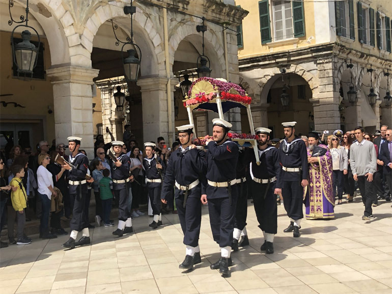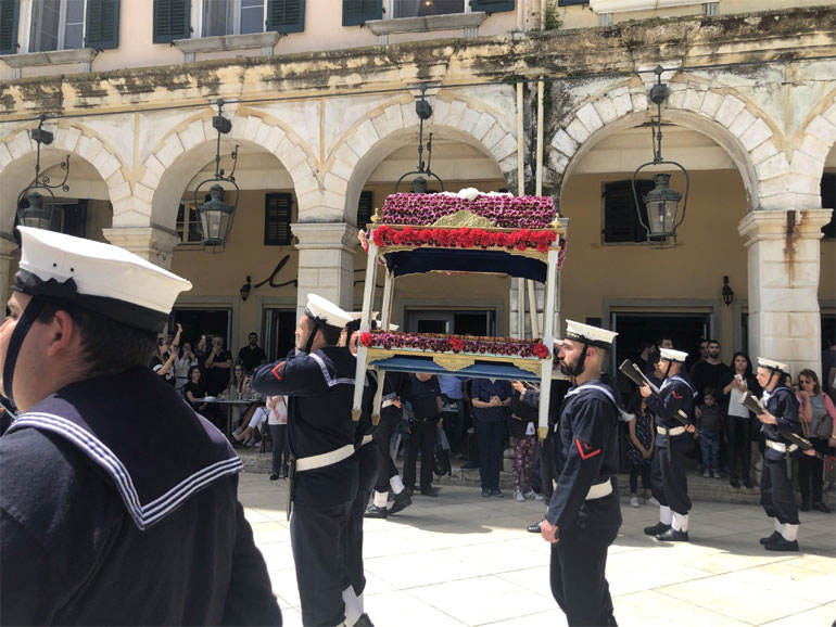 Η Κέρκυρα βυθίζεται σε απόλυτη κατάνυξη. Το «Αντάτζιο του Τομάζο Αλμπινόνι και άλλα πένθιμα εμβατήρια θα παιανίζοντε από τις φιλαρμονικές του νησιού, ενώ χορωδίες και χιλιάδες κόσμου θα συνοδεύουν τους επιταφίους.