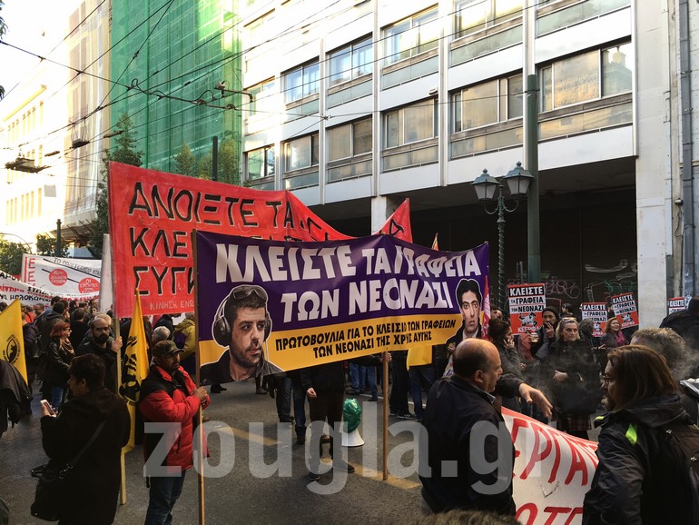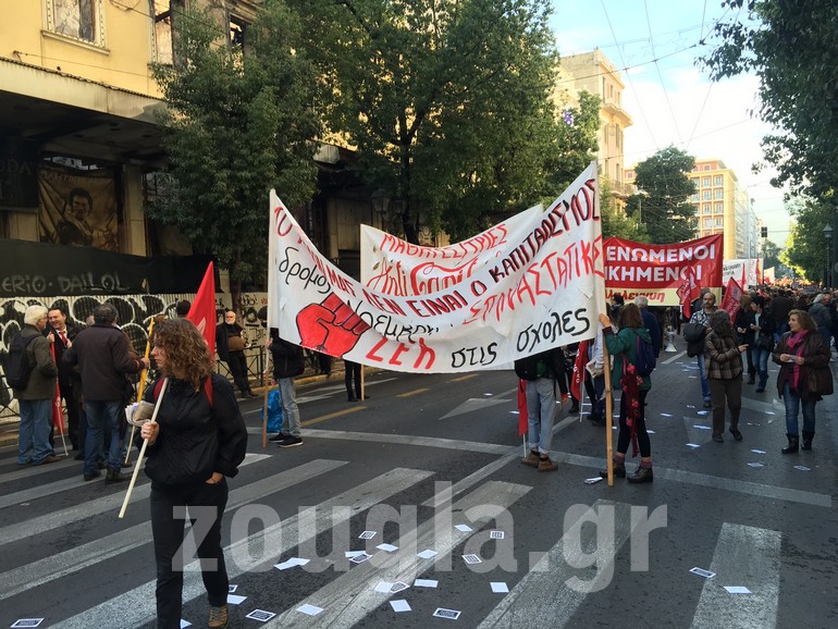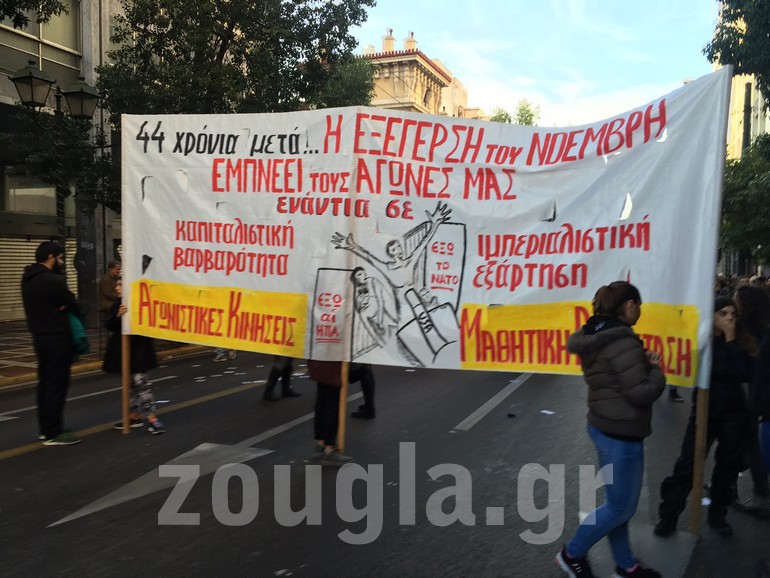 Ολοκληρώθηκε η ξεχωριστή πορεία που πραγματοποίησαν τα μέλη της ΠΑΣΠ με την αιματοβαμμένη σημαία του Πολυτεχνείου, που έχουν στην κατοχή τους μετά την διάλυση της ΕΦΕΕ. Τα μέλη της ΠΑΣΠ συγκεντρώθηκαν αρχικά στη συμβολή των οδών Ιπποκράτους και Ακαδημίας, στη συνέχεια κατευθύνθηκαν προς το Πολυτεχνείο όπου και άνοιξαν τη σημαία φωνάζοντας «αδέρφια ζείτε εσείς μας οδηγείτε». Κατόπιν το μπλοκ με τη σημαία συγκροτήθηκε πάλι και θα κινηθεί προς την αμερικάνικη πρεσβεία.