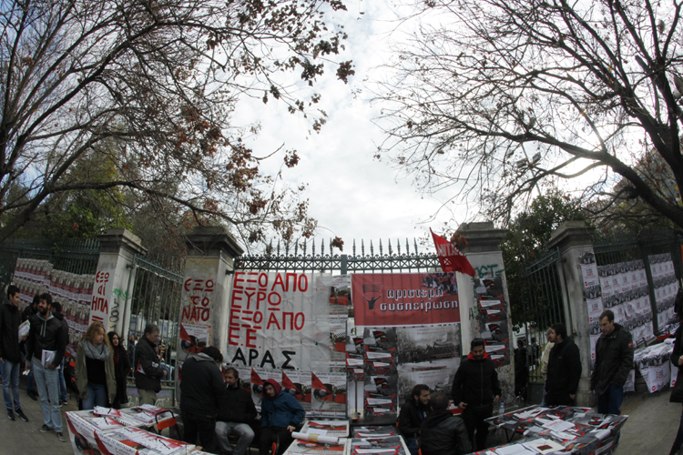 Φοιτητικές νεολαίες έσπευσαν να στήσουν τα τραπεζάκια τους στον προαύλιο χώρο και την παράσταση έκλεψε ένα πανό με… επίκαιρο μήνυμα.