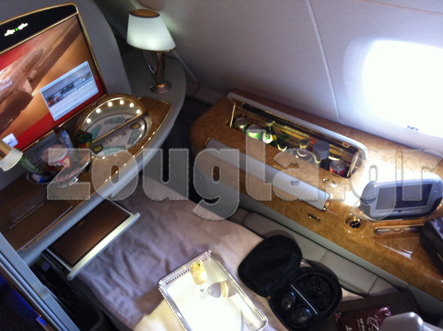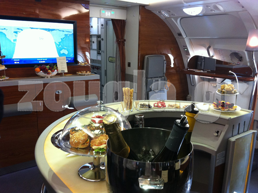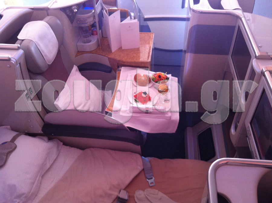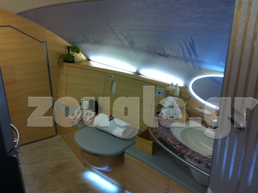 Οι διάδρομοι στον… ισόγειο είναι ατελείωτοι ενώ ανεβαίνοντας με τα σκαλιά (!) στον πιο πάνω όροφο αντικρίζεις το.. μπαρ! Συνεχίζεις και εντυπωσιάζεσαι με τις διακεκριμένες θέσεις που παρέχουν πολλές ανέσεις στους επιβάτες ενώ τα καθίσματα έχουν τη δυνατότητα να μεταμορφωθούν σε κρεβάτια μήκους 2 μέτρων. Η μεγάλη έκπληξη έρχεται αμέσως μετά και συγκεκριμένα στις 14 διακεκριμένες θέσεις  που θυμίζουν μίνι σουίτες με τον κάθ’ ένα επιβάτη να μην έχει επαφή με τον άλλο. Εδώ οι επιβάτες νοιώθουν βασιλιάδες ενώ η δυνατότητα να κάνεις ακόμα και.. . μπάνιο σε συνδυασμό με shower spa (για 5 λεπτά) πίνοντας το ποτό σου είναι κάτι που δεν συναντάς στα αεροπλάνα ης γραμμής.