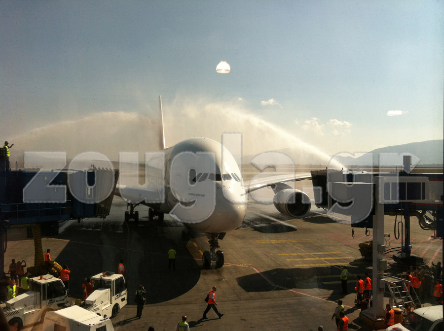 Λίγο μετά τις 13:00 σήμερα το μεσημέρι προσγειώθηκε στο Διεθνή Αερολιμένα Αθηνών «Ελευθέριος Βενιζέλος» το μεγαλύτερο επιβατικό αεροσκάφος που έχει ποτέ βρεθεί επί ελληνικού εδάφους. Ο λόγος για το αεροσκάφος τύπου Α380 της Εmirates το οποίο υποδέχτηκαν με.. τιμές οι άνθρωποι του αεροδρομίου, ενώ πλήθος κόσμου βρέθηκε στο σημείο για να το θαυμάσει.